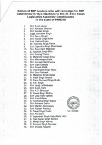 ਤਰਨਤਾਰਨ ਵਿਧਾਨ ਸਭਾ ਹਲਕੇ ਵਿਚ 11 ਨਵੰਬਰ ਨੂੰ ਹੋਣ ਜਾ ਰਹੀ ਜ਼ਿਮਨੀ ਚੋਣ ਦੌਰਾਨ ਭਾਰਤੀ ਜਨਤਾ ਪਾਰਟੀ ਨੇ ਵੱਲੋਂ ਇਸ ਚੋਣ ਵਿਚ ਪ੍ਰਚਾਰ ਕਰਨ ਲਈ 40 ਸਟਾਰ ਪ੍ਰਚਾਰਕਾਂ ਦੀ ਸੂਚੀ ਚੋਣ ਕਮਿਸ਼ਨ ਨੂੰ ਸੌਂਪੀ ਹੈ ਜਿਨ੍ਹਾਂ ਵੱਲੋਂ ਆਉਣ ਵਾਲੇ ਦਿਨਾਂ ’ਚ ਪਾਰਟੀ ਉਮੀਦਵਾਰ ਹਰਜੀਤ ਸਿੰਘ ਸੰਧੂ ਲਈ ਧੂੰਆਂਧਾਰ ਪ੍ਰਚਾਰ ਕੀਤਾ ਜਾਣਾ ਹੈ। ਇਸ ਸੂਚੀ ਵਿਚ ਹਰਿਆਣਾ ਅਤੇ ਦਿੱਲੀ ਦੇ ਮੁੱਖ ਮੰਤਰੀ ਜਿੱਥੇ ਸ਼ਾਮਲ ਹਨ। ਉਥੇ ਹੀ ਕੇਂਦਰੀ ਮੰਤਰੀ ਵੀ ਅਗਲੇ ਦਿਨਾਂ ’ਚ ਰੈਲੀਆਂ, ਮੀਟਿੰਗਾ ਅਤੇ ਡੋਰ ਟੂ ਡੋਰ ਪ੍ਰਚਾਰ ਕਰਦੇ ਦਿਖਾਈ ਦੇਣਗੇ।