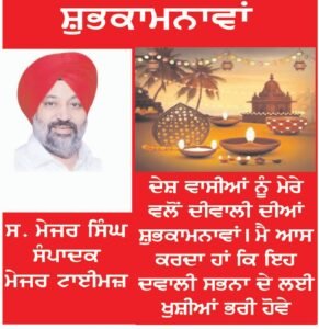 ਮੇਜਰ ਟਾਈਮਜ਼ ਦੇ ਮੁਖ ਸੰਪਾਕਦ ਸ. ਮੇਜਰ ਸਿੰਘ ਨੇ ਸਾਰੇ ਦੇਸ਼ ਵਾਸੀਆਂ, ਖਾਸ ਕਰਕੇ ਪੰਜਾਬੀਆਂ ਨੂੰ ਦੀਵਾਲੀ ਅਤੇ ਬੰਦੀ ਛੋੜ ਦਿਵਸ ਦੇ ਸ਼ੁਭ ਮੌਕੇ ’ਤੇ ਹਾਰਦਿਕ ਵਧਾਈਆਂ ਦਿੱਤੀਆਂ ਹਨ। ਉਨਾਂ ਕਿਹਾ ਕਿ ਇਹ ਦੋਵੇਂ ਤਿਉਹਾਰ ਰੌਸ਼ਨੀ, ਖੁਸ਼ਹਾਲੀ, ਸੱਚਾਈ ਦੀ ਜਿੱਤ ਅਤੇ ਆਪਸੀ ਭਾਈਚਾਰੇ ਦਾ ਪ੍ਰਤੀਕ ਹਨ। ਉਨ੍ਹਾਂ ਕਿਹਾ ਕਿ ਅੱਜ ਦੇ ਦਿਨ ਭਗਵਾਨ ਸ੍ਰੀ ਰਾਮ ਚੰਦਰ ਜੀ ਬੁਰਾਈ ’ਤੇ ਜਿੱਤ ਹਾਸਲ ਕਰਕੇ 14 ਸਾਲਾਂ ਬਾਅਦ ਅਯੋਧਿਆ ਵਾਪਸ ਆਏ ਸਨ । ਉਨ੍ਹਾ ਕਿਹਾ ਕਿ ਬੰਦੀ ਛੋੜ ਦਿਵਸ ਸਿੱਖ ਇਤਿਹਾਸ ਵਿੱਚ ਛੇਵੇਂ ਗੁਰੂ ਸ੍ਰੀ ਹਰਗੋਬਿੰਦ ਸਾਹਿਬ ਜੀ ਵੱਲੋਂ 52 ਹਿੰਦੂ ਰਾਜਿਆਂ ਨੂੰ ਗਵਾਲੀਅਰ ਦੇ ਕਿਲ੍ਹੇ ਤੋਂ ਰਿਹਾਅ ਕਰਾਉਣ ਦੀ ਯਾਦ ਵਿੱਚ ਮਨਾਇਆ ਜਾਂਦਾ ਹੈ। ਉਨ੍ਹਾਂ ਲੋਕਾਂ ਨੂੰ ਇਹ ਤਿਉਹਾਰ ਮਿਲਜੁਲ ਕੇ, ਸੁਰੱਖਿਅਤ ਅਤੇ ਪ੍ਰਦੂਸ਼ਣ ਰਹਿਤ ਤਰੀਕੇ ਨਾਲ ਮਨਾਉਣ ਦੀ ਅਪੀਲ ਕੀਤੀ ਹੈ।