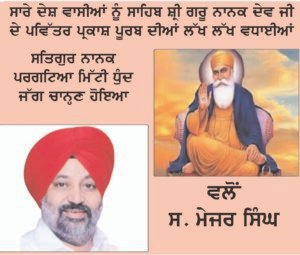 ਮੇਜਰ ਟਾਈਮਜ਼ ਦੇ ਮੁੱਖ ਸੰਪਾਦਕ ਸ. ਮੇਜਰ ਸਿੰਘ ਨੇ ਸਾਰੇ ਦੇਸ਼ ਵਾਸੀਆਂ ਨੂੰ ਸਾਹਿਬ ਸ਼੍ਰੀ ਗੁਰੂ ਨਾਨਕ ਦੇਵ ਜੀ ਦੇ ਪਾਵਨ ਪਰਗਟ ਦਿਵਸ ਦੀ ਵਧਾਈ ਦਿੱਤੀ। ਇਸ਼ ਮੌਕੇ ਉਨ੍ਹਾਂ ਕਿਹਾ ਕਿ ਸਾਹਿਬ ਸ਼੍ਰੀ ਗੁਰੂ ਨਾਨਕ ਦੇਵ ਜੀ ਸਭਨਾ ’ਤੇ ਆਪਣੀ ਕਿਪਰ ਬਣਾਈ ਰੱਖਣ।